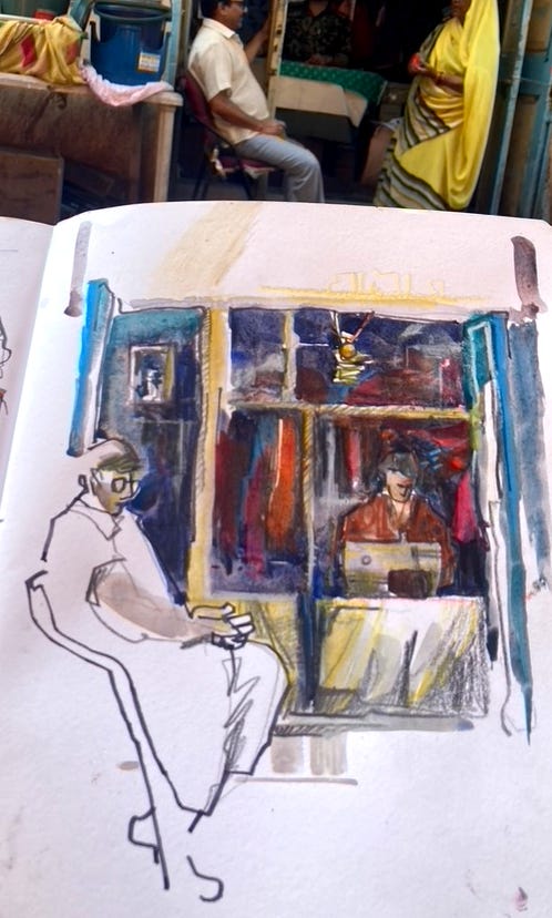 This next sketch of a tiny shop in India is built in practically one flat plane, with the foreground character giving it some depth.