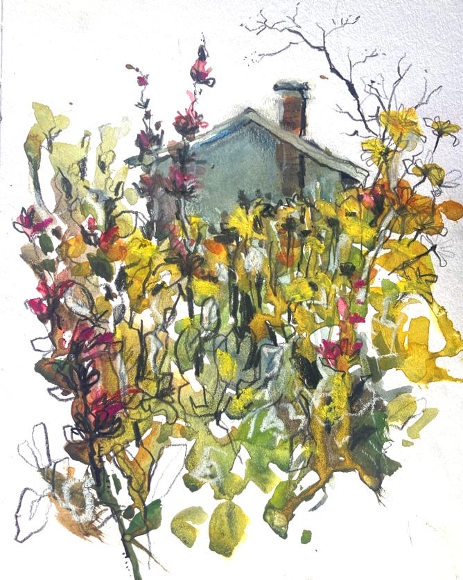 • Think like a Stage Designer. Think in layers, like you would when designing a simple set for a school play. This sketch has a straightforward setup, with two layers juxtaposed against each other: a foreground layer of wildflowers and a background layer featuring the house. You get the idea of distance because the flowers tower over the house, indicating that they are close to you.